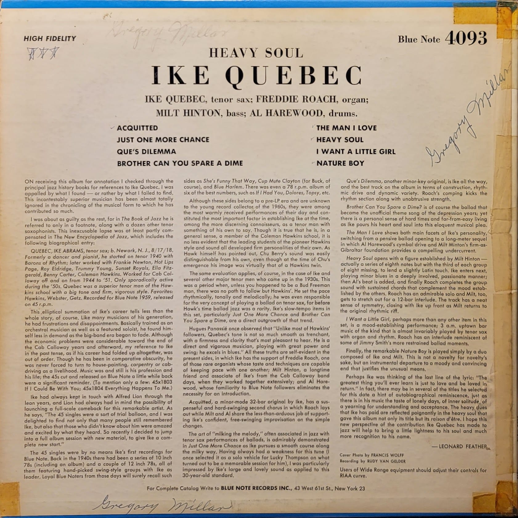 First US Mono pressing of this lovely record. Numerous marks but this record sounds great due to being a Plastylite with RVG runouts. There is one pop in the silence between the first and second track on S1, but otherwise this plays with minimal here-and-there under-crackle that the music towers above. Corners and spine have needlessly, but expertly been pre-taped to prepare for splitting which never came. Gregory Millan has also made some ballpoint marks on the rear, including his name, but otherwise this cover is in very nice shape.